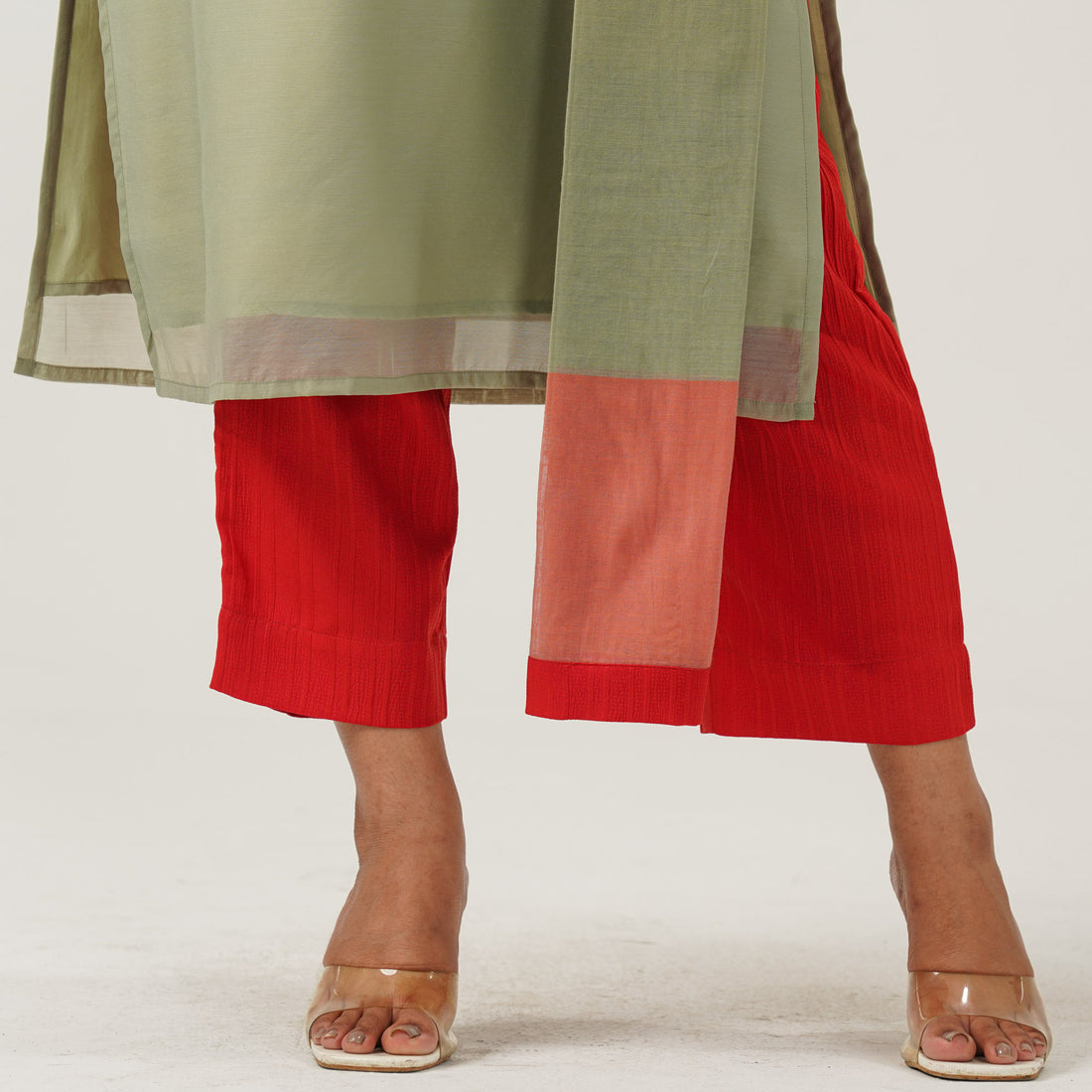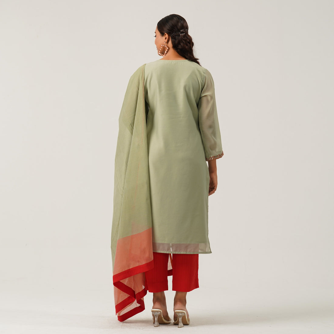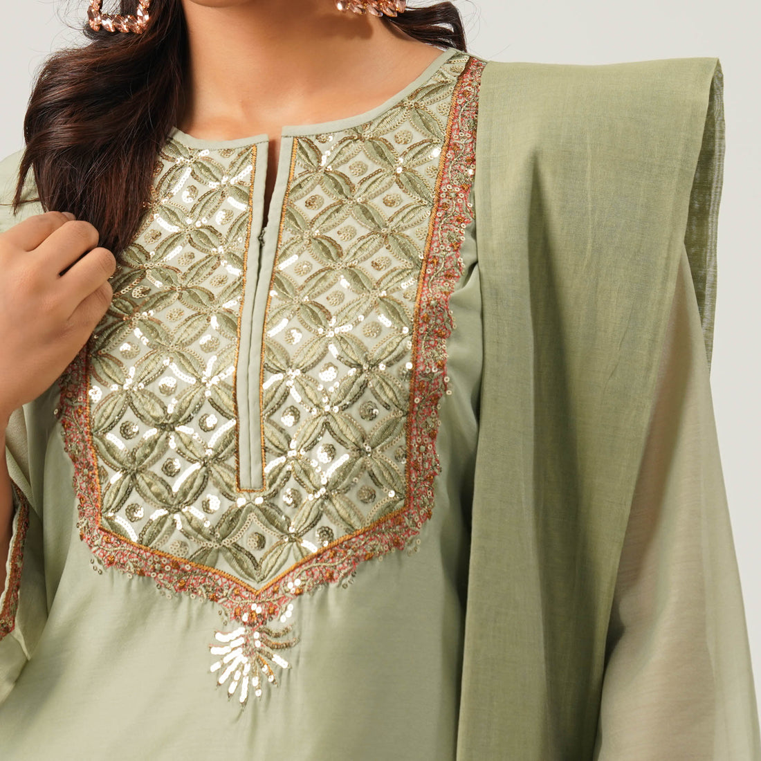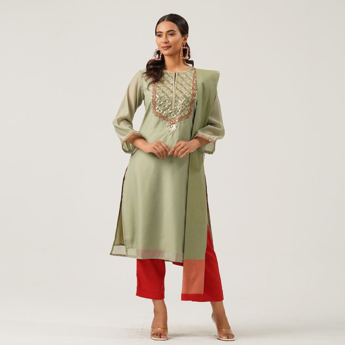This elegant 3-piece ethnic set features a sequin-embroidered yoke with a lined dress made from half silk fabric. The inner layer is crafted from soft butter silk for added comfort. It includes a blended pant and a beautifully paired half silk tant orna. Perfect for festive occasions or traditional gatherings.